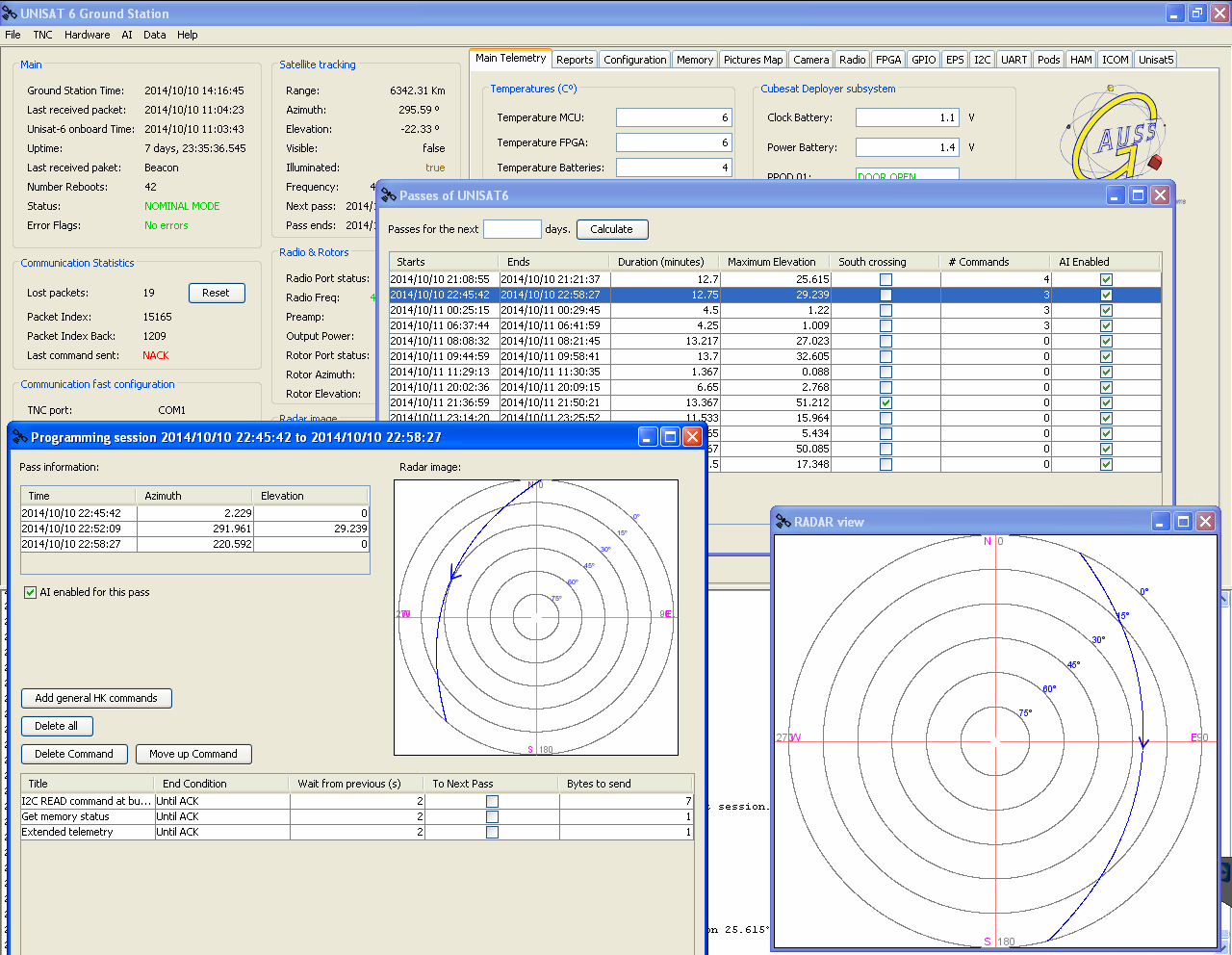 We have also completed the works on the ground station, we have now ended two weeks of full automatic operations without the need of operators. We now have a weekly meeting to decide the operations of the satellite and within a few minutes all the commands for the following week can be loaded on the ground station than then properly handles the commanding and the download of telemetry or picture data. If any anomalies occur, the ground would always send a warning email to the operators on call and halt the operations waiting for human control.